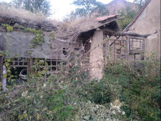 顺着石头铺成的小路往西,行了不远就到了离西山最近的地方。呈现在眼前的是一个颓废而毫无生气的村落,这里街巷荒芜冷清,我仿佛置身于某个影视剧的拍摄现场了。村子里静的出奇,静的让人发毛生畏,没有了农村应有的鸡鸣犬吠牲畜跑的景象。所有的院子不是锈迹斑斑的铁将军看门,就是蛛网蒿草荆棘堵路。“扑棱棱……”冷不丁从脚下飞出一只野鸡,加上几声布谷的鸣叫,着实让人打个激灵。破烂的窗棂,腐朽的门框,倒塌的门楼告诉来客,这里久已无炊烟了。