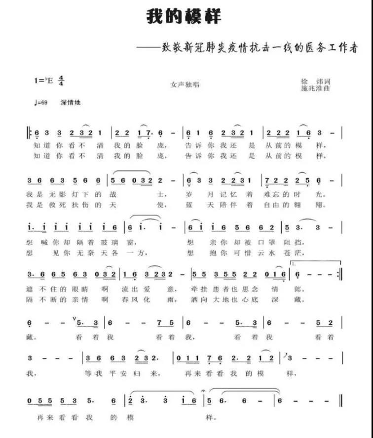 刚刚收到挚友徐炜先生作词的歌曲《我的模样》,歌词是对抗疫中医护女神与情郎隔窗凝望瞬间的心理描写,没有华丽的词藻,没有高亢的口号,朴实不华的文字,掀开深情的心潮。