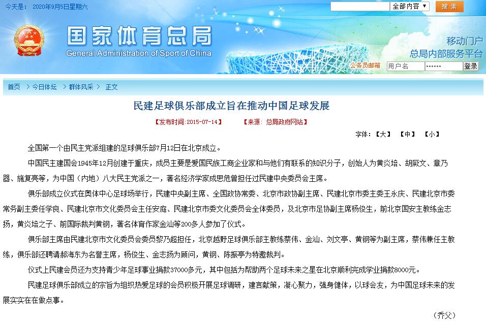 全国第一个由民主党派组建的足球俱乐部于2015年7月12日在北京成立。