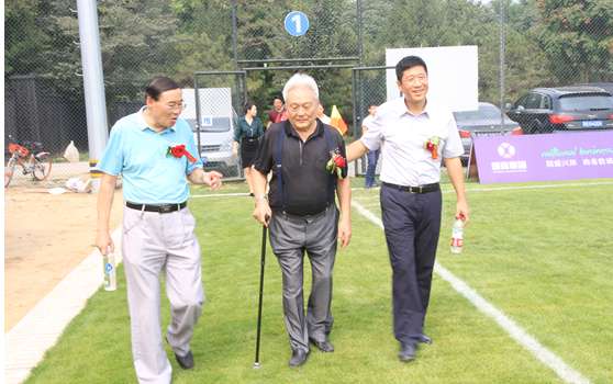在“海信日立杯”2017北京地产足球联赛上,85岁高龄的“中国足球教父”、原中国足协主席年维泗在民建北京市委文化委足球俱乐部、北京住宅房地产业商会会长黎乃超(右)等的陪同下走进比赛场地